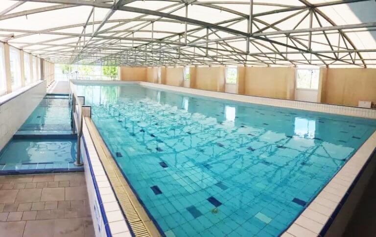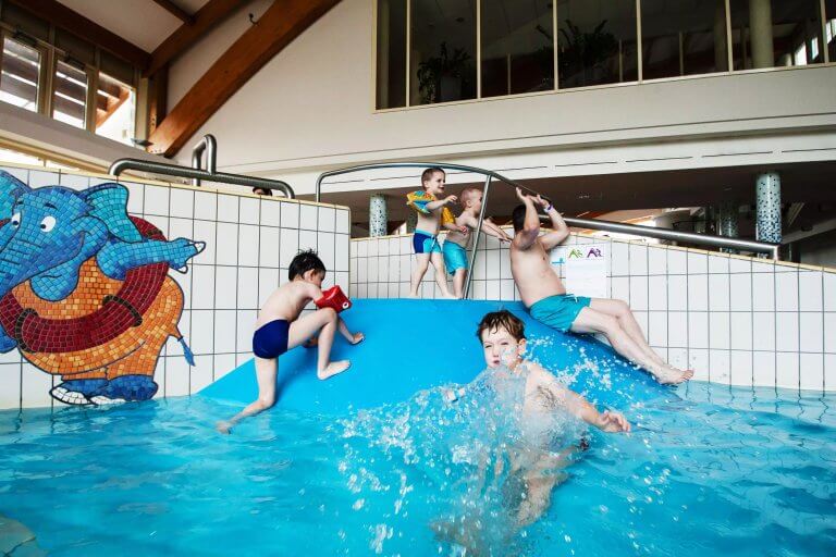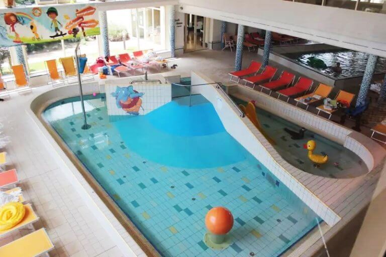 Kleine und große, Außen- und Innen-Erlebnisbecken, von denen man bei schönem Wetter bequem in das große Außen-Erlebnisbecken hinausschwimmen kann.