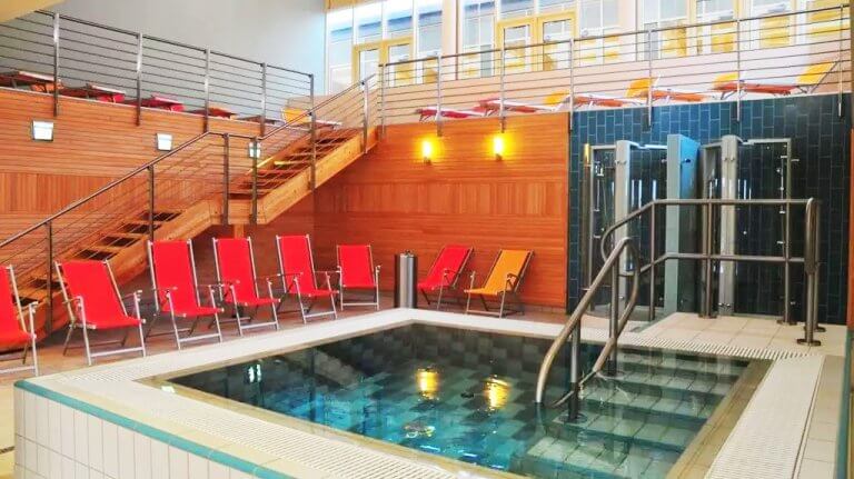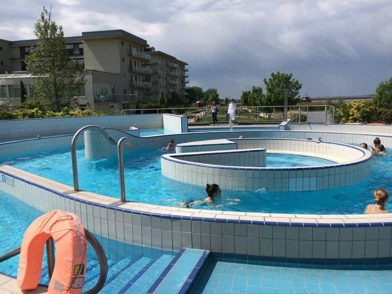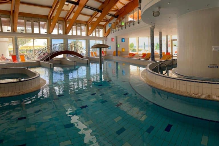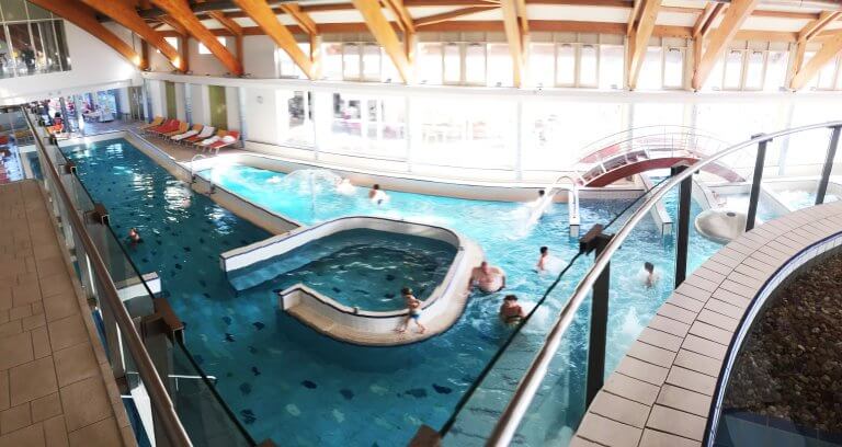 Kis és nagy, kül- és beltéri élménymedencék, melyből jó idő esetén könnyedén ki lehet úszni a kültéri nagy élmény medencébe.